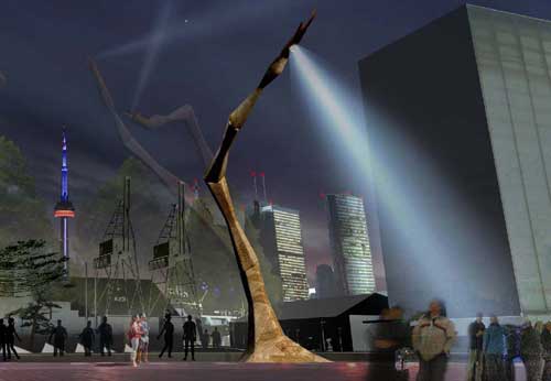Yes, the wind sculpture by Ned Kahn would be fantastic, but what is the compelling reason for it to be in this location, and how is it remotely site-specific if it’s essentially similar to all of Kahn’s other wind sculptures? In fact, the Weatherfront team went out of its way to fuss about how we get our weather from Pearson International instead of the waterfront, but since weather stations are traditionally located at airports, the best place for this Ned Kahn sculpture would in fact be directly across from the island airport, not at Jarvis Slip. Not to mention the perversity of placing a screen of this kind across the line-of-sight of the best view from Jarvis Slip (across to the islands), or the fact that the ripples, waves and motion of water in a bay as large as Toronto’s harbour is nearly as endlessly interesting, fluid and dynamic as Kahn’s sculpture would have been, so again, why here? In fact, such a sculpture would be awesome covering one of the buildings facing Dundas Square, not here where the natural glories of Toronto’s harbour are on full display for all to see.